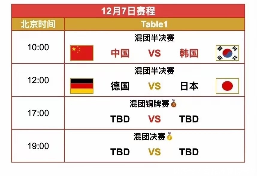 第二阶段轮回赛适度后,中国队、日本队、韩国队、德国队晋级四强。从实力分析,中国队与日本队的举座实力和辅导王人强于韩国队与德国队,他们省略率会在半决赛胜出,晋级决赛争夺冠军。半决赛,中国队迎战韩国队,日本队对阵德国队。期待国乒遂愿晋级决赛!
